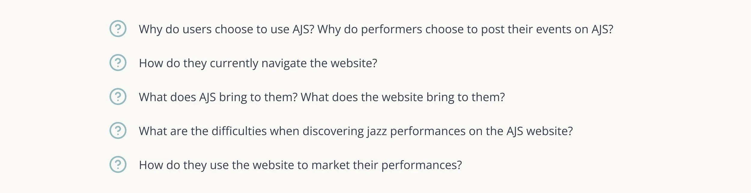 To understand the challenges faced by both jazz lovers and performers, we examined user feedback, conducted interviews, and observed interactions with the existing AJS website. This research revealed several key pain points: